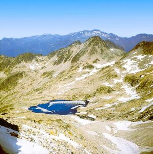 Pico (3.308 m de alt.) sit. en el térm. de Benasque (Huesca).Pico de la Maladeta (3.308 m de alt.) y lago de Coronas a su lado. Detrás el Pico de Argüells y el Collado de Cregüeña. Al fondo se ...